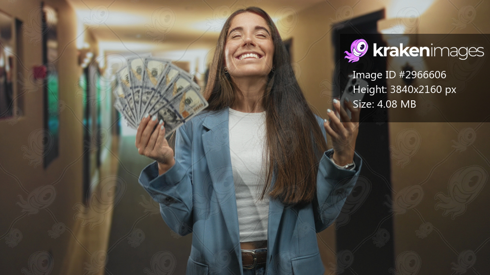 Young woman holding fanned dollars and smartphone, smiling in hotel corridor wearing blue blazer and belt; financial success joy.