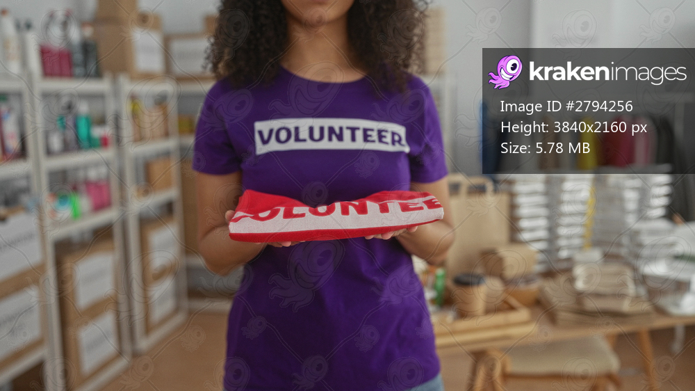 Young woman holding folded shirt in charity center showcasing volunteer work in indoor setting filled with organized shelves and donation items