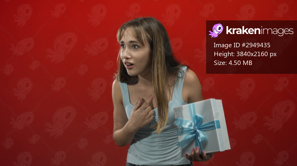 Young woman holding gift box with hand to chest in studio red backdrop wearing light blue top; surprise gratitude.