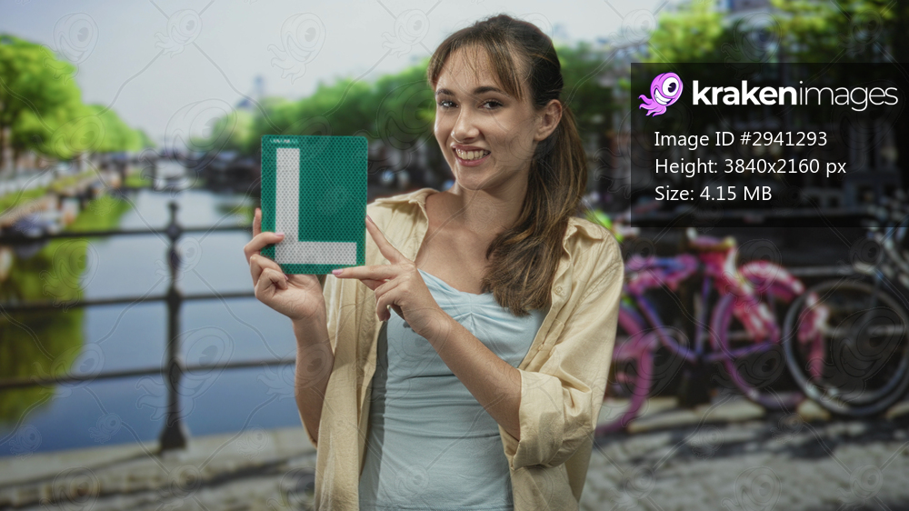 Young woman holding green l plate and points finger to l plate while smiling on street in amsterdam; confidence.