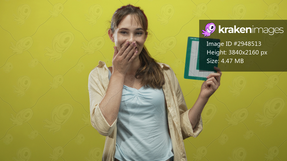 Young woman holding green learner l plate with hand to mouth gesture in yellow studio; playful learning success.