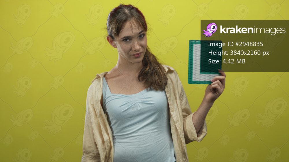Young woman holding green learner l plate with hand to mouth gesture in yellow studio; playful learning success.