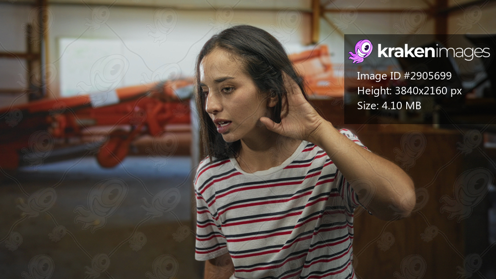 Young woman holding hand to ear inside building near heavy orange machinery and wooden counter; listening focus concern.