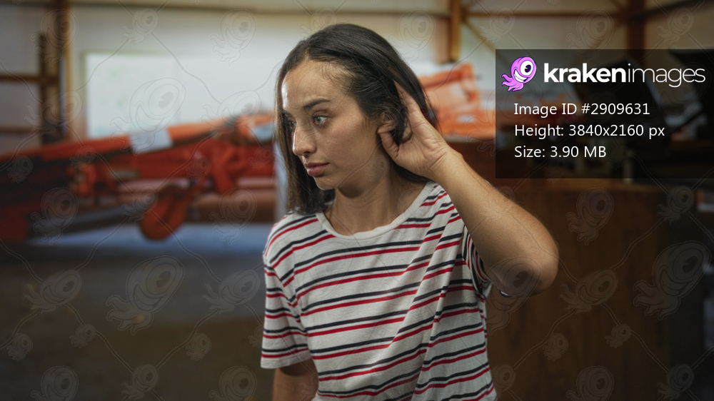 Young woman holding hand to ear inside building near heavy orange machinery and wooden counter; listening focus concern.