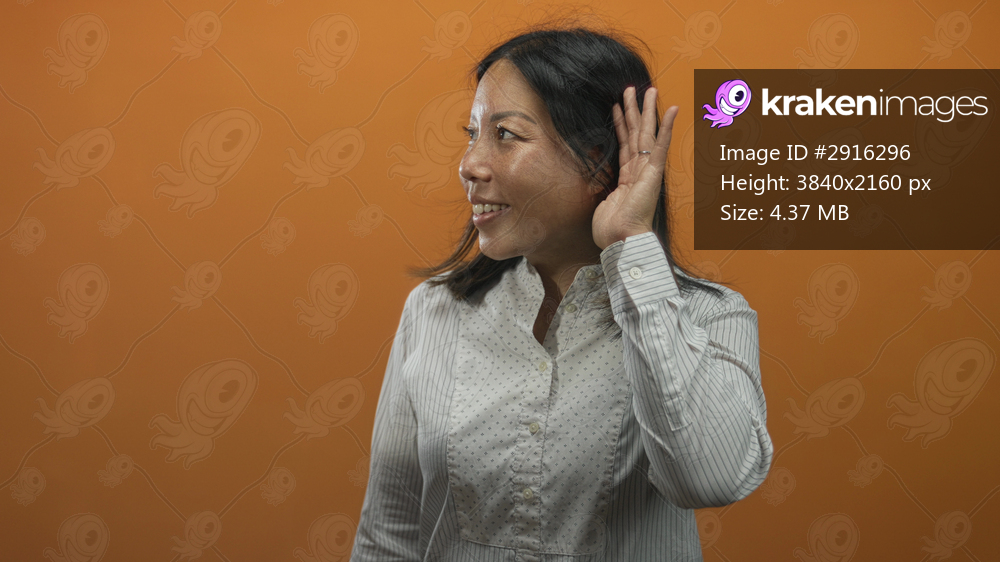 Young woman holding hand to ear and smiling in orange studio listening pose; curiosity listening focus.