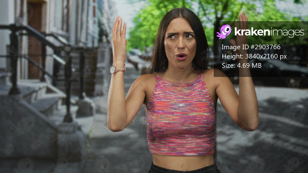 Young woman holding hands to her head on a city street with crop top and bare midriff visible; confusion dilemma.