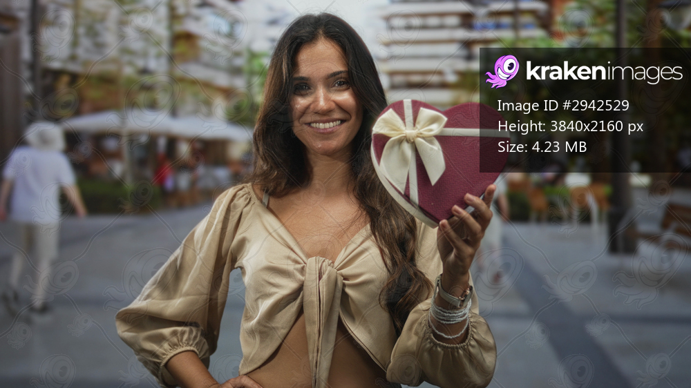 Young woman holding heart gift box on city street smiling, hand extended showing gift and tied top revealing chest; romance joy.
