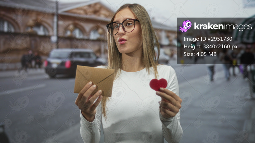Young woman holding kraft envelope and small red heart with hands extended toward camera on busy city street; doubt romance.