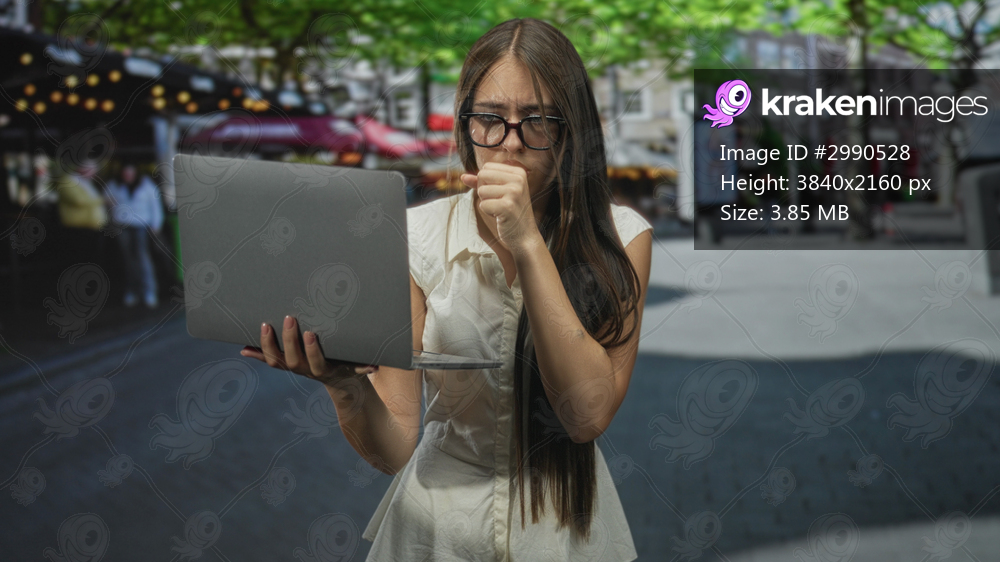 Young woman holding laptop coughs into fist on street near outdoor cafe and string lights, glasses and white blouse visible; health concern.