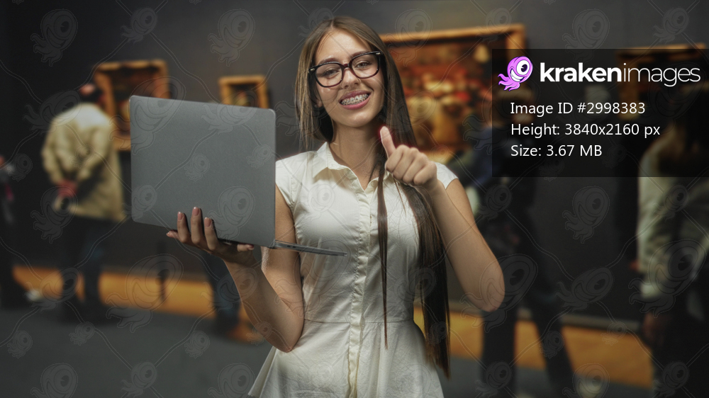 Young woman holding laptop and giving thumbs up while later checking the screen with a puzzled look in a museum building; curiosity learning.