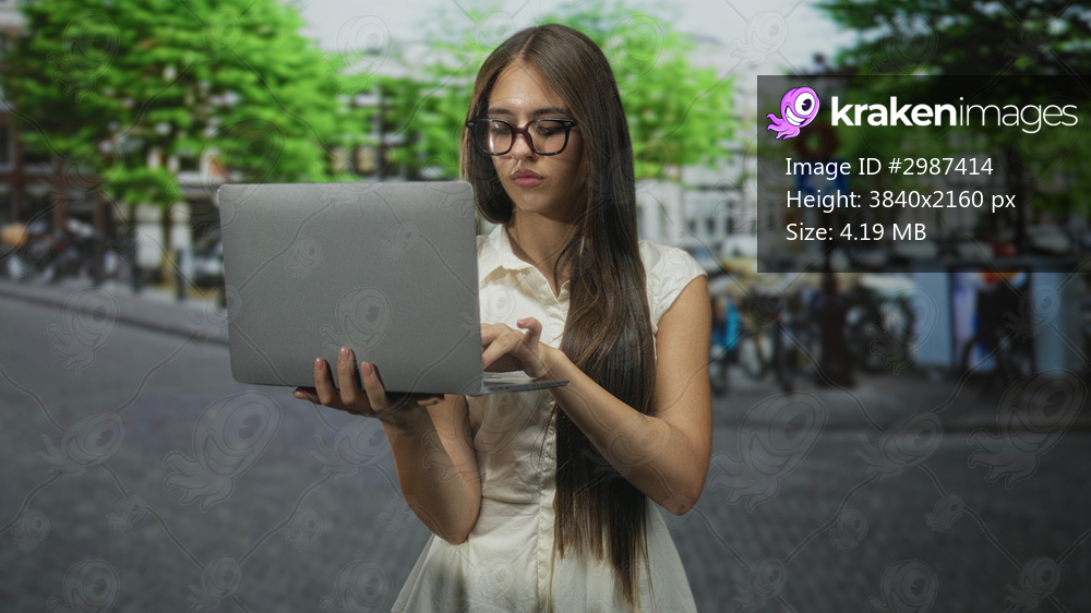 Young woman holding laptop with left hand and typing with right hand on a cobblestone street lined with bicycles and trees; concentration.