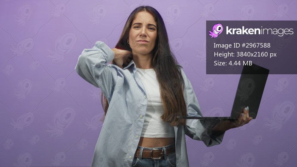 Young woman holding laptop and rubbing neck while standing against purple backdrop in studio; discomfort work strain.