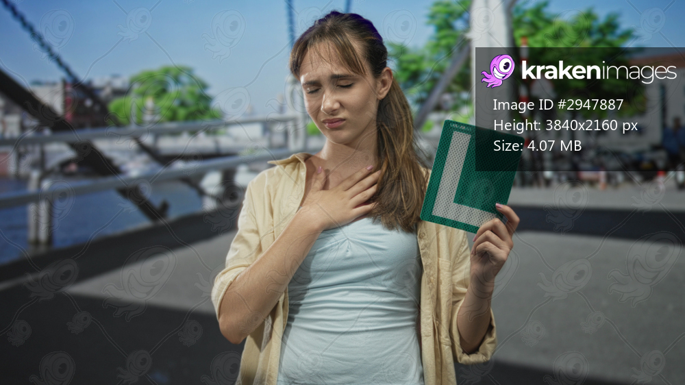 Young woman holding learner plate and pressing hand to throat on a busy street bridge near canal, visible discomfort and learner sign; learner stress.