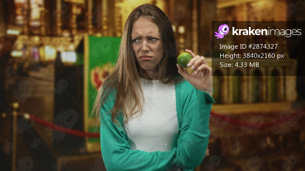 Young woman holding lime and frowning inside a catholic church by the altar and red velvet rope; disgust doubt.
