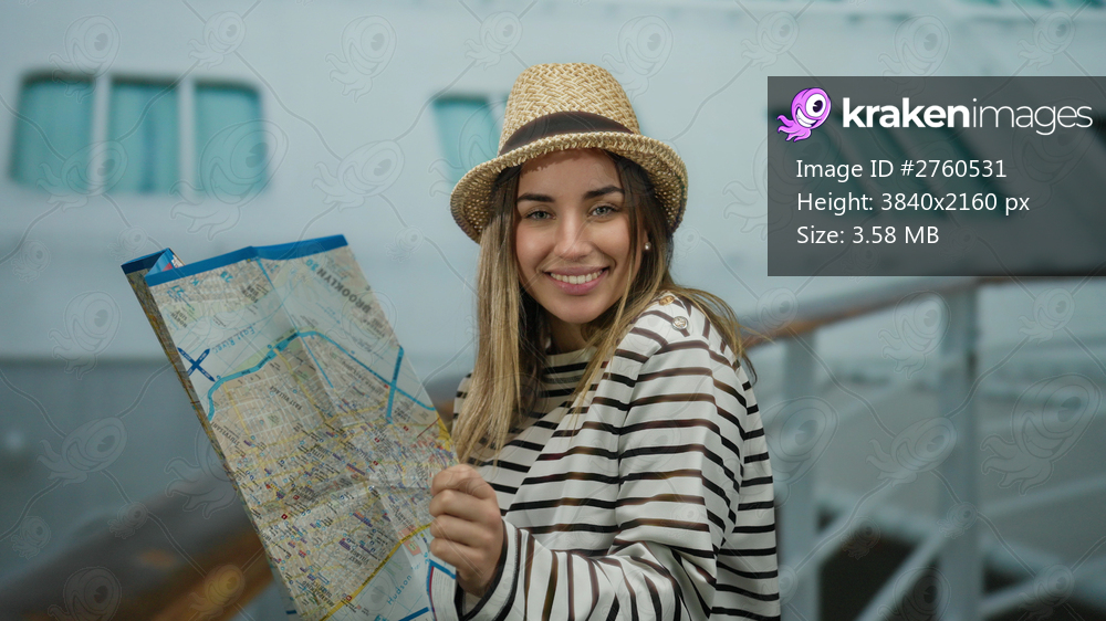 Young woman holding map on boat cruise, enjoying outdoor tour on seaside, wearing casual clothing against a nautical backdrop, showcasing travel and exploration vibes. - Kraken Images