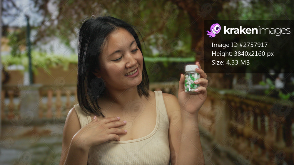 Young woman holding medicine bottle with pills while smiling outdoors on a city street, demonstrating a health concept in an urban outdoor setting with lush greenery and architecture - Kraken Images