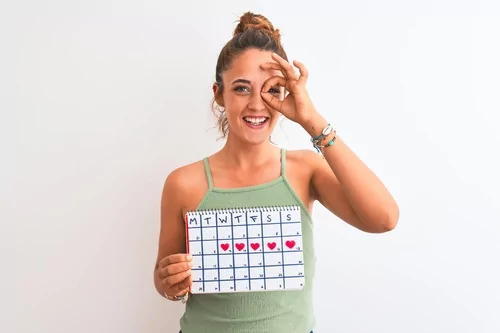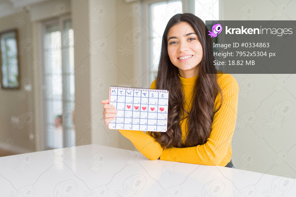 Young woman holding menstruation calendar with a happy face standing and smiling with a confident smile showing teeth