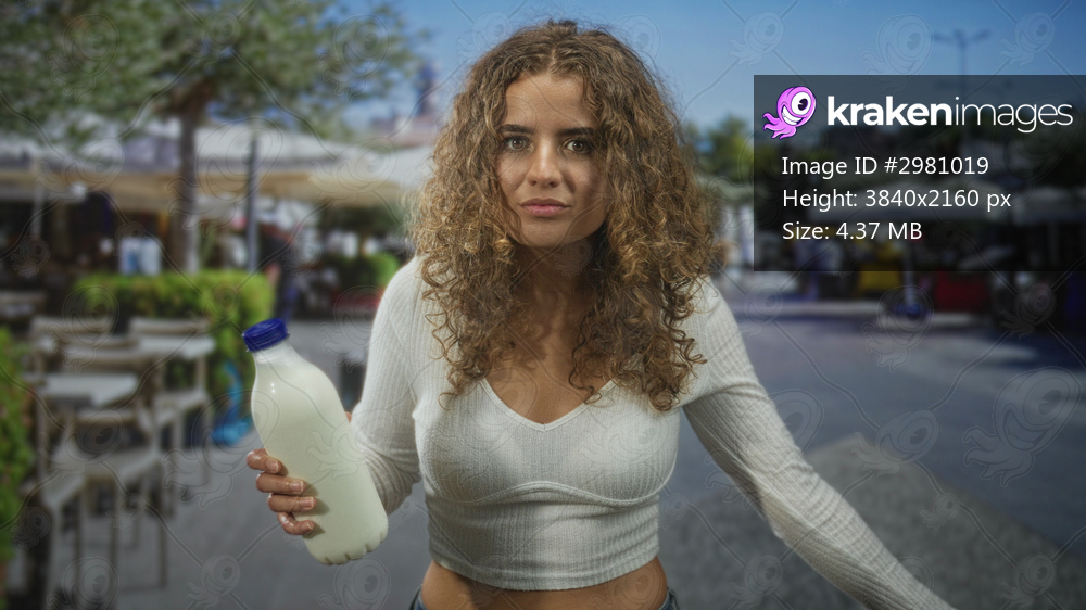 Young woman holding milk bottle on a street market near outdoor cafe, showing exposed midriff and closed eyes; quiet calm.