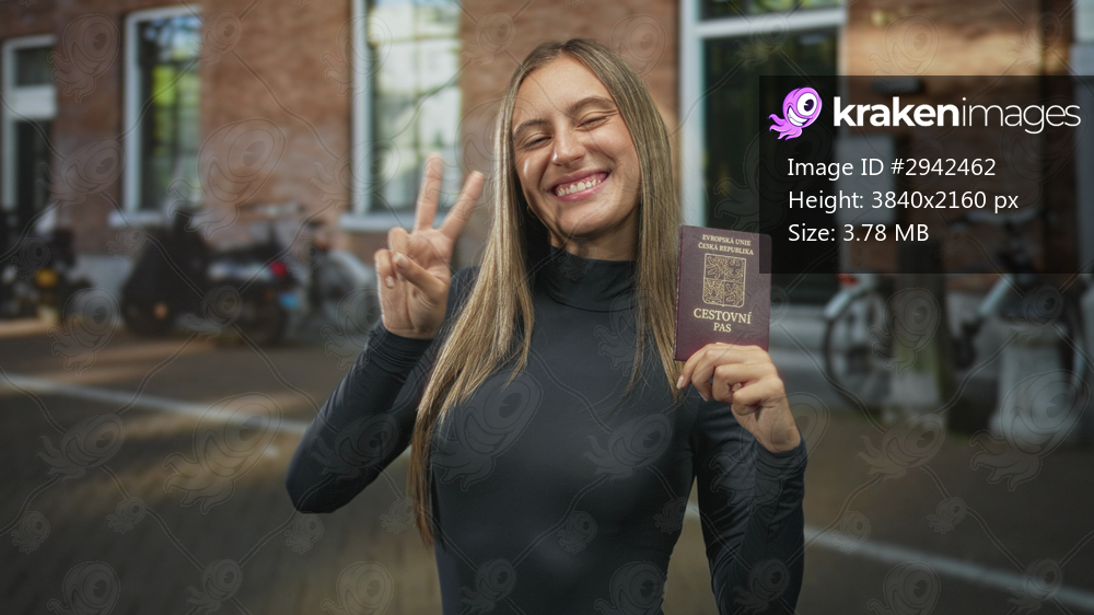 Young woman holding passport and flashing peace sign on street in front of brick building; travel milestone joy.