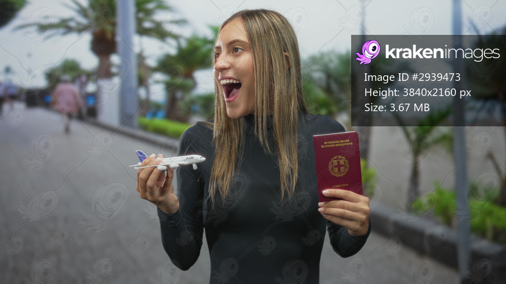 Young woman holding passport and toy airplane on a seaside street promenade flanked by palm trees and path; travel excitement.
