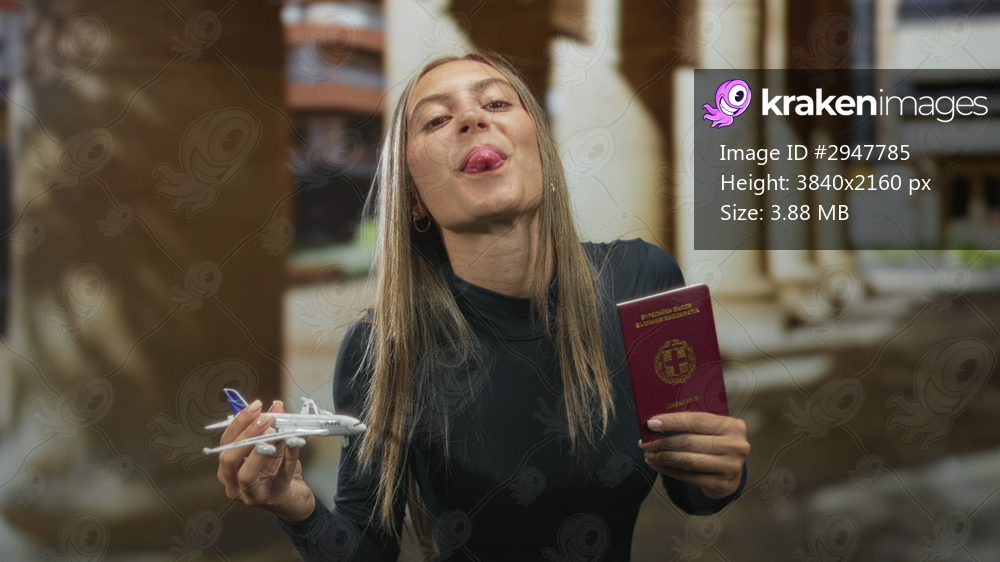 Young woman holding passport and toy airplane while smiling and sticking out tongue at a columned building entrance; playful travel excitement.
