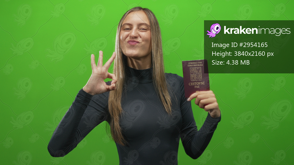Young woman holding passport up with right hand and smiling with closed eyes in studio green screen set; joy.