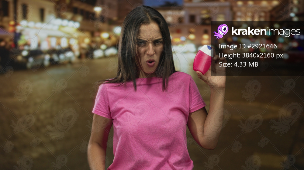 Young woman holding pink deodorant in hand, grimacing and stepping back on a busy city street at night; disgust product rejection.
