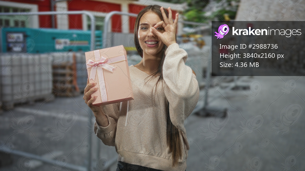 Young woman holding pink gift box, making ok sign with fingers, smiling with braces, wearing beige sweater on street near barriers and containers; happy surprise. - Kraken Images