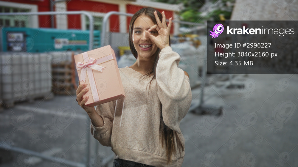 Young woman holding pink gift box, making ok sign with fingers, smiling with braces, wearing beige sweater on street near barriers and containers; happy surprise. - Kraken Images