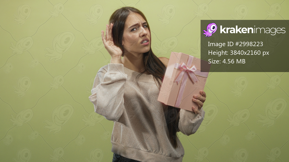 Young woman holding pink gift box while cupping ear and looking puzzled, studio shot; curiosity reaction.