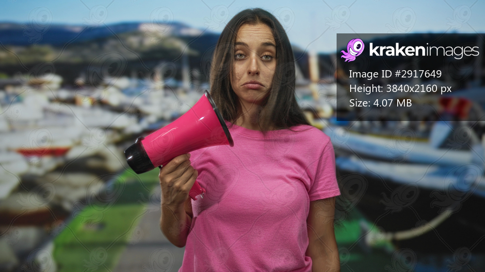 Young woman holding pink megaphone and shrugging on street pier with boats and marina in seaside port scene; announcement uncertainty.