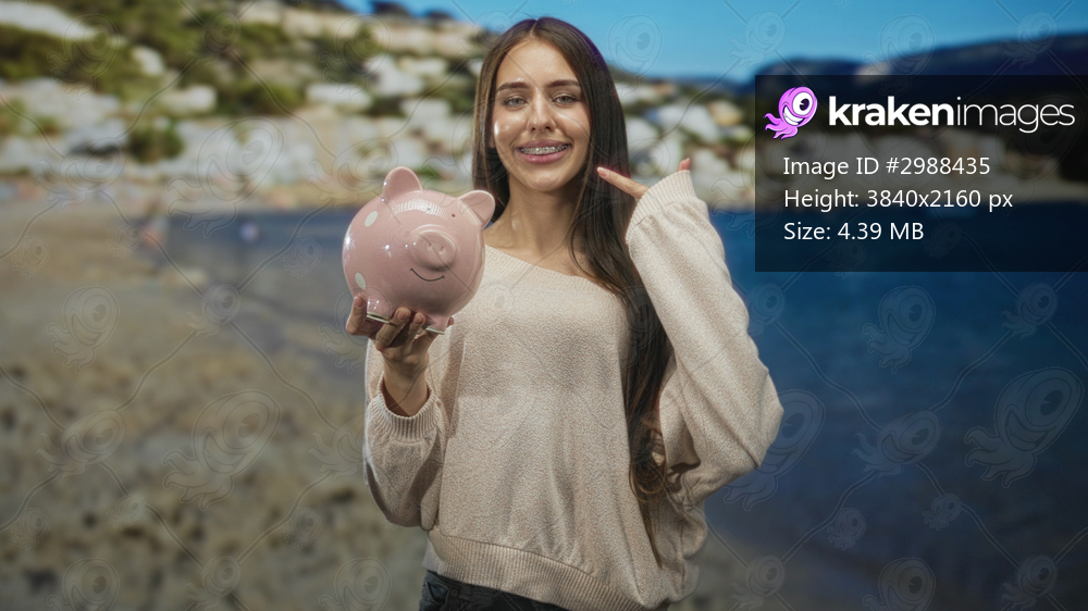 Young woman holding pink piggy bank and pointing finger to it in studio; saving optimism future security.
