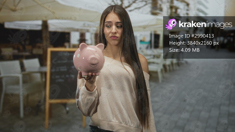 Young woman holding pink piggybank forward with outstretched hand and sad expression on street cafe terrace; financial concern.