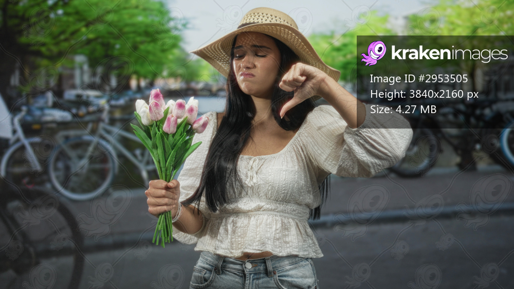 Young woman holding pink tulips with thumbs down gesture on a street lined with bicycles by a canal; rejection disappointment.
