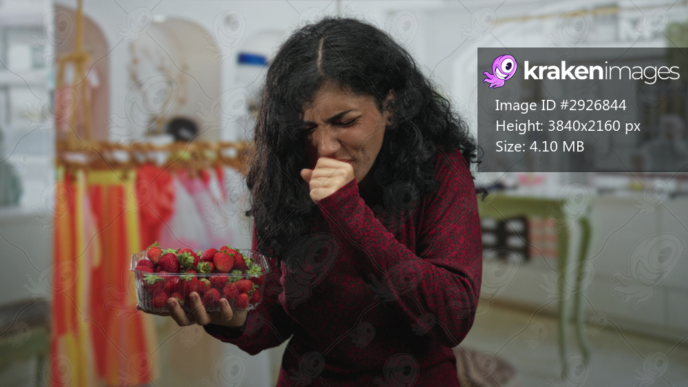 Young woman holding plastic punnet of strawberries and coughing into her fist in building; allergy concern discomfort.
