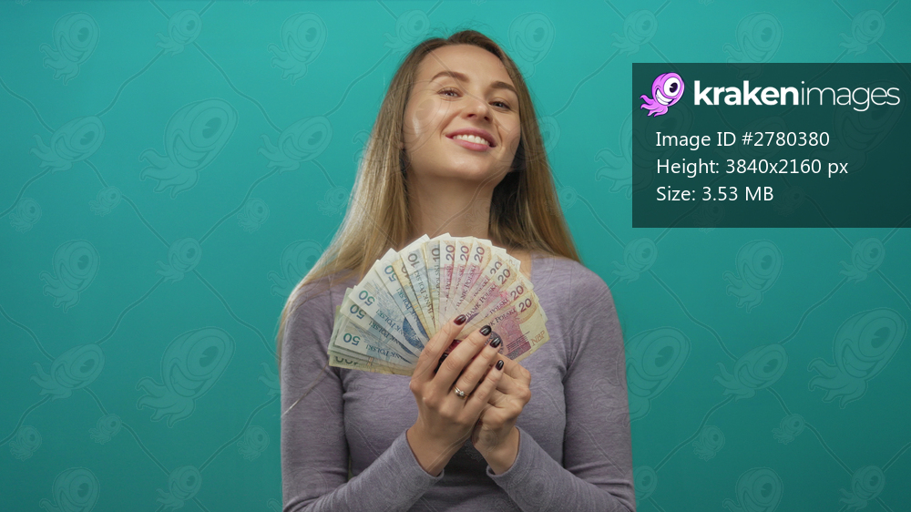 Young woman holding polish zloty banknotes against a vibrant green background, smiling confidently, representing financial success and prosperity.