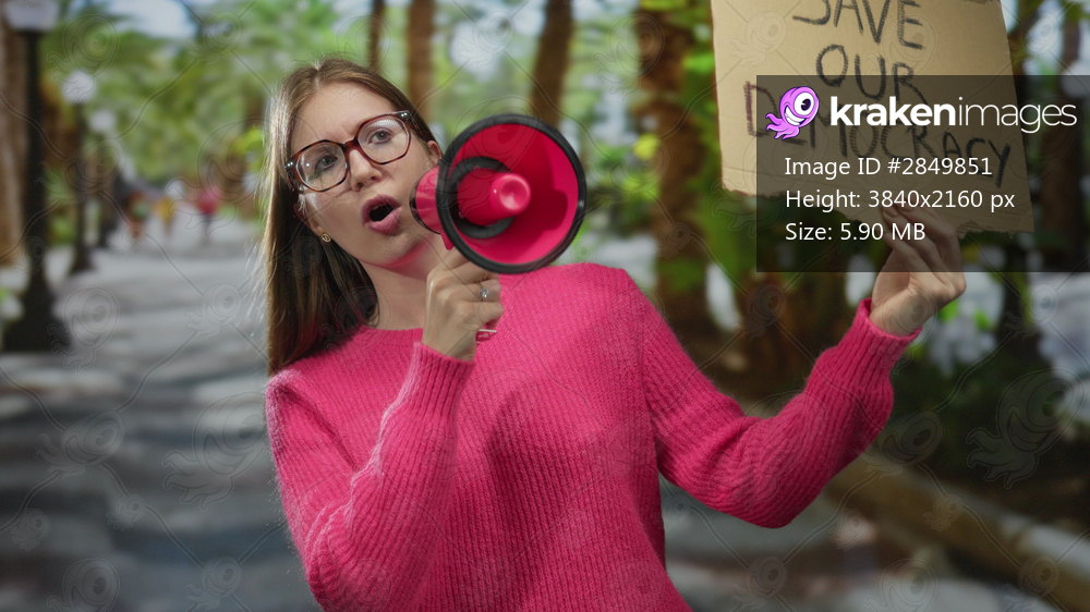 Young woman holding protest sign and speaking into megaphone in green park; determination empowerment activism.