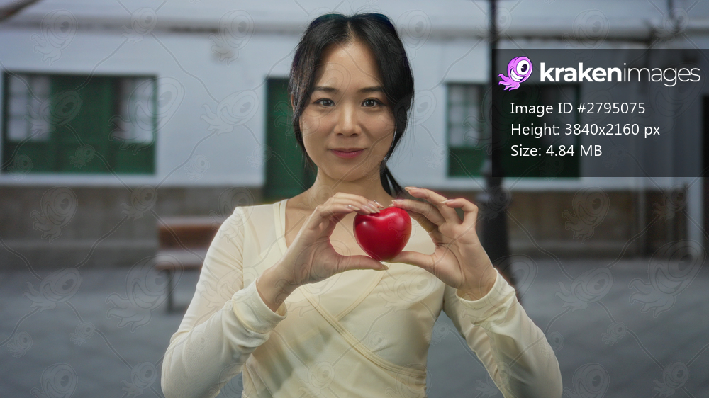 Young woman holding red heart outdoors with a joyful expression, emphasizing positivity and happiness in a serene urban setting, creating a warm and inviting atmosphere - Kraken Images
