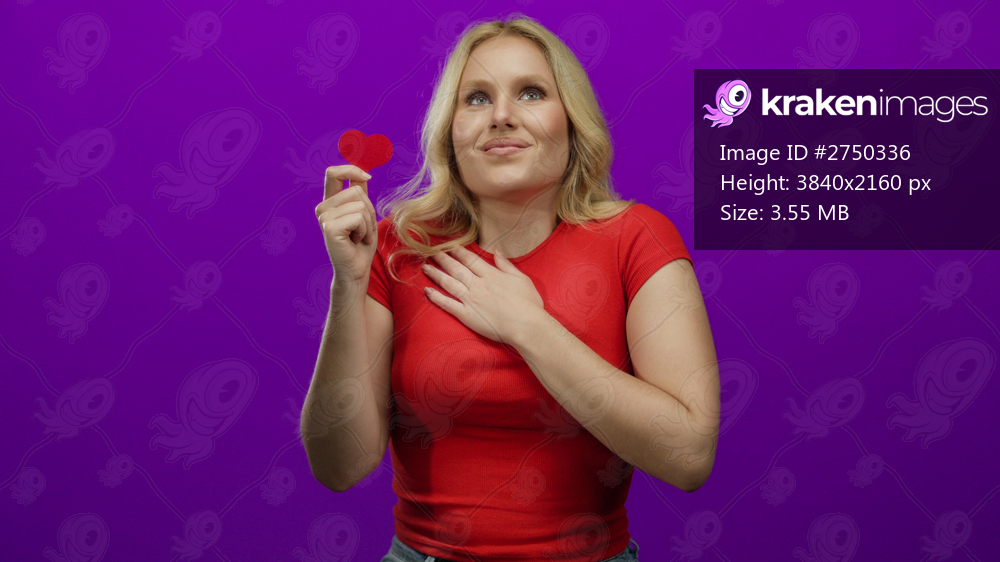 Young woman holding red heart smiling against vibrant purple background conveying love and positivity