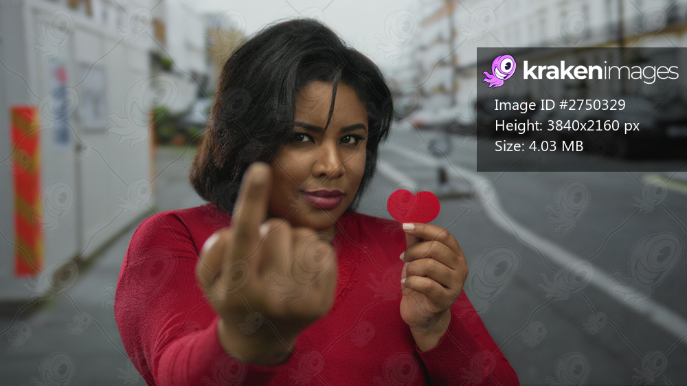 Young woman holding red paper heart on city street, symbolizing love and confidence.