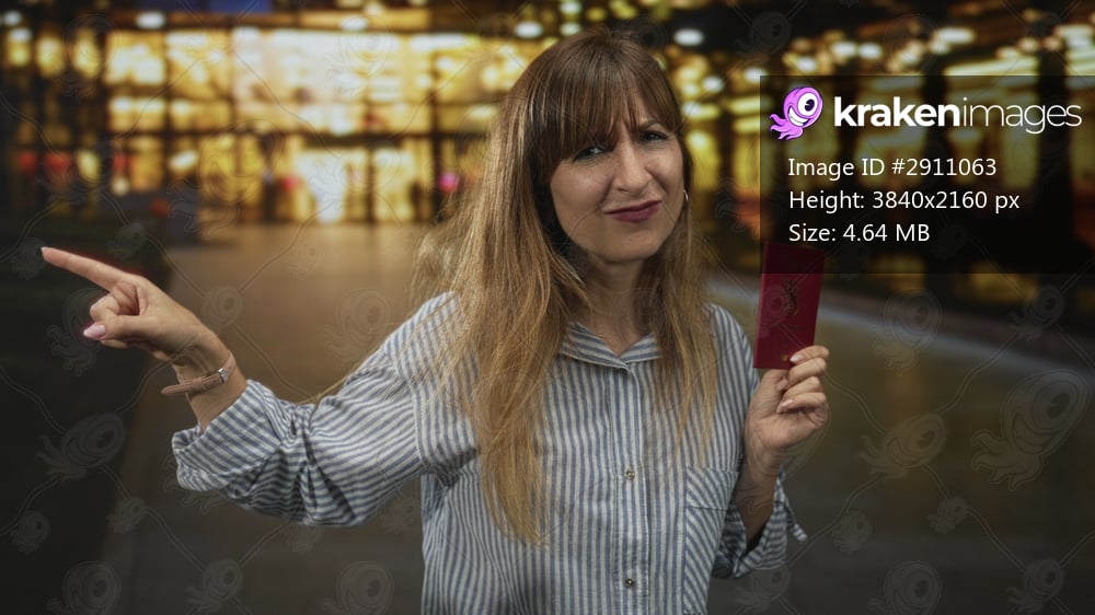 Young woman holding red passport and pointing finger at airport terminal entrance under evening lights; travel confidence.
