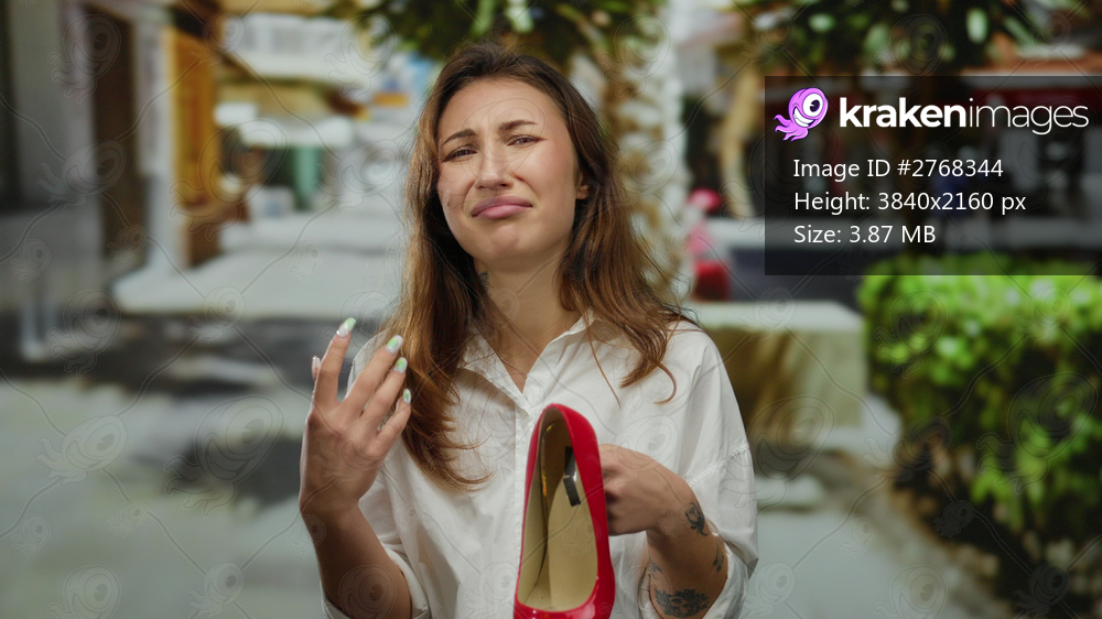 Young woman holding red shoe with frustrated expression standing on city street surrounded by urban scenery during daytime