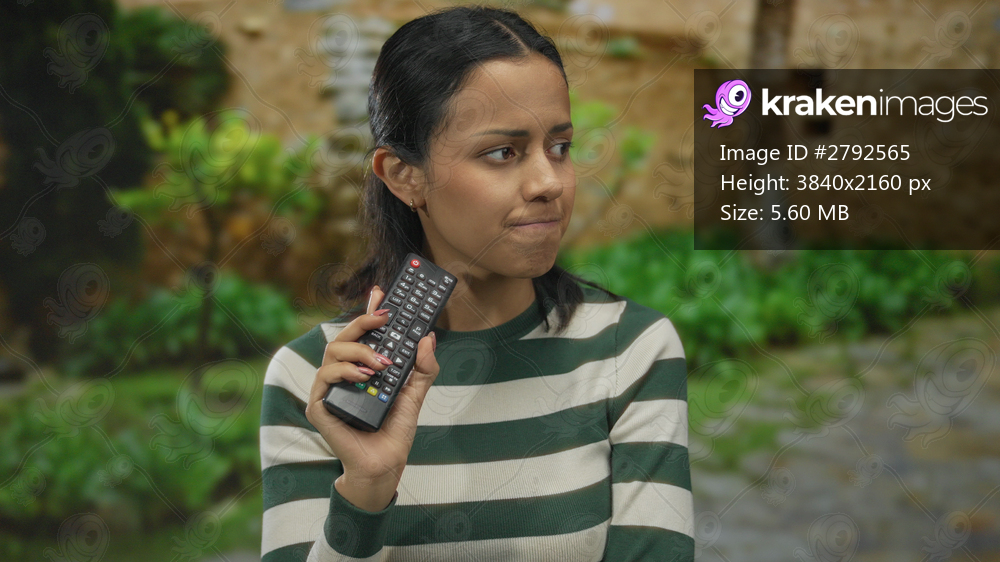 Young woman holding remote control outdoors showing thoughtful expression in a garden setting with greenery and brick wall background emphasizing casual and relaxed ambiance. - Kraken Images
