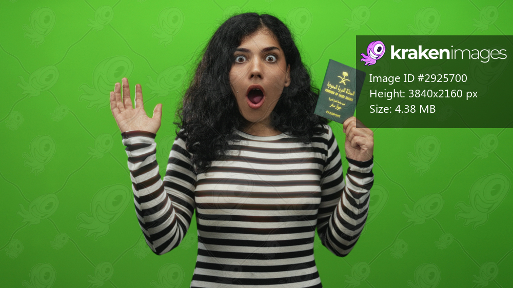Young woman holding saudi passport with mouth open and hand raised in green studio; surprise travel documents.