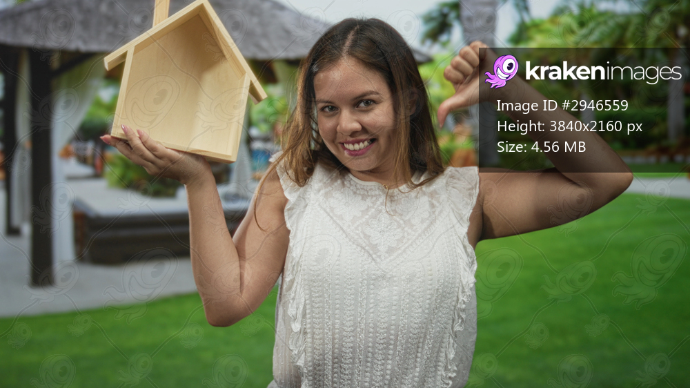 Young woman holding small wooden house model and showing thumbs down in a green park with palm trees and pavilion; disapproval home sale.