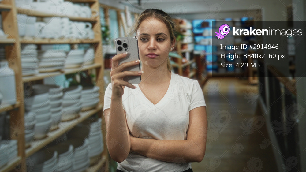 Young woman holding smartphone with arms crossed in home decor store aisle, pouting with closed eyes; shopping annoyance.