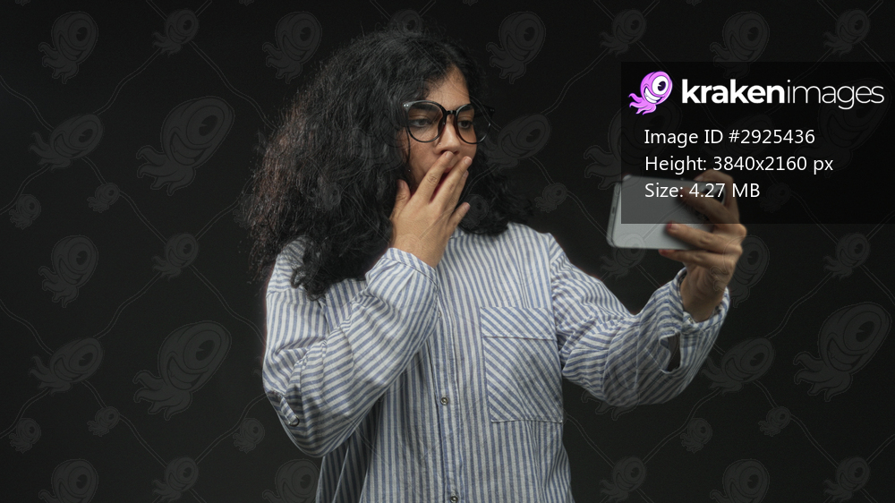 Young woman holding smartphone and covering mouth with hand while looking at screen in black studio; surprise reaction.