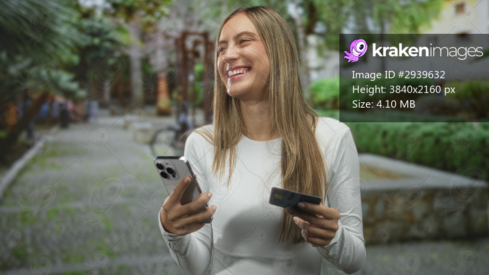 Young woman holding smartphone and credit card, hands visible, laughing on a park walkway; happiness convenience.