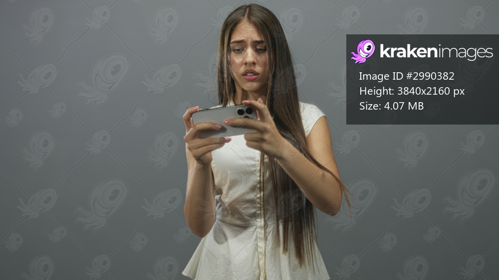 Young woman holding smartphone with furrowed brow and tense hands in studio white top, staring at screen and frowning; digital anxiety.