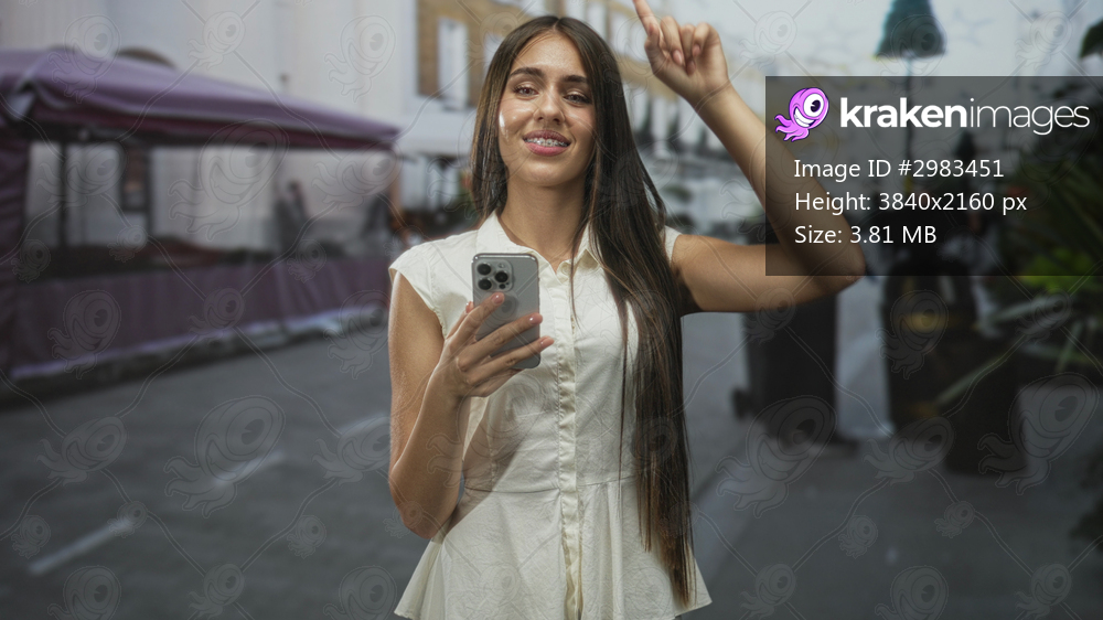 Young woman holding smartphone in right hand and pointing index finger upward on a city street market while smiling to camera; playfulness self expression. - Kraken Images